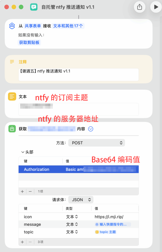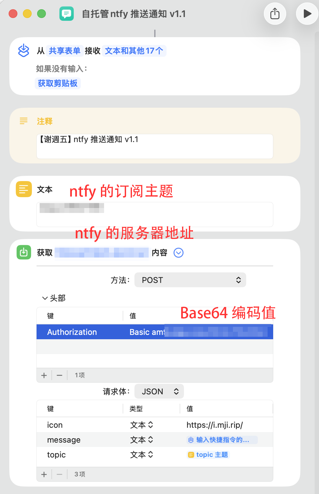 如果是自托管和官方付费 ntfy 服务提供的加密私有 ntfy 主题,除了快捷指令模版里现有的字段,还需要额外增加一条包含用户名密码的 hash 信息的 header 字段。
