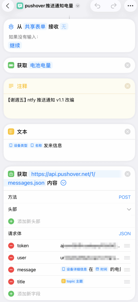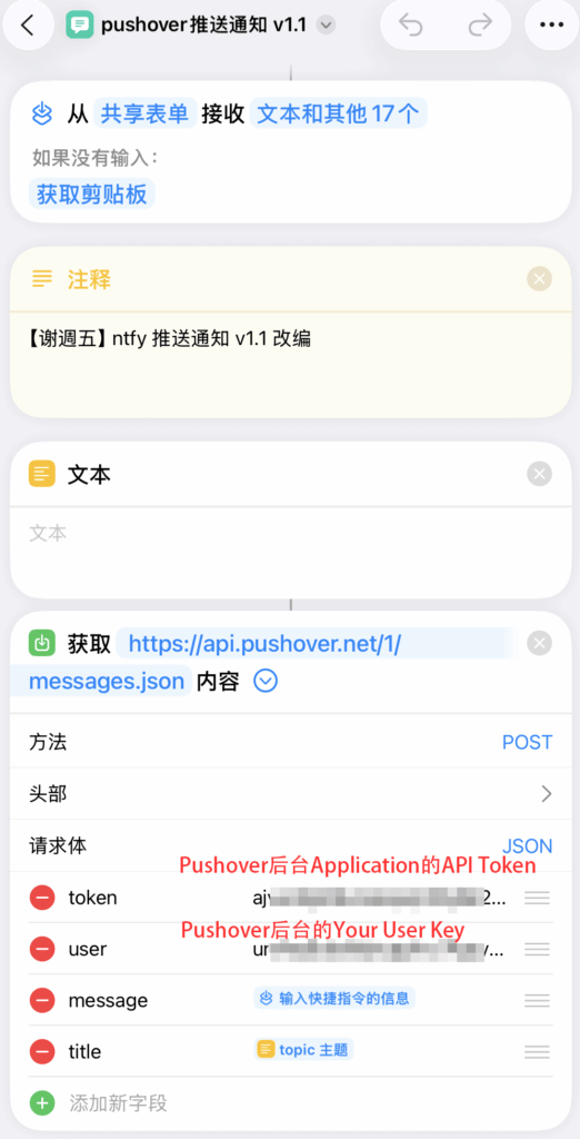 和 ntfy 一样,Pushover 的推送也只需要一条 webhook 就可以执行,于是把上面那个快捷指令按照 Pushover 的文档修改一下,就可以给自己的 Pushover 账号发送信息了。