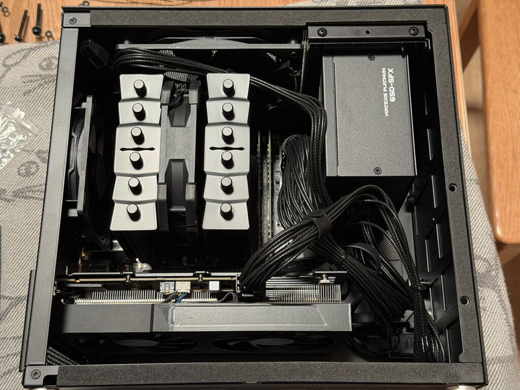 把几年前捡垃圾存到现在的 QTB2 CPU、微星 H401I PRO WIFI、16GB x 2 DDR4-2666 和在 4 号机升级时为了和 Noctua U12S 对比而购入的利民 Silver Soul 135 塞入这台 12L 的机箱后,因为电源只用了 SFX 的关系还有不少空余。ATX 电源大多配备 60cm 左右的长线,在这个机箱里可能会更加拥挤也是我最后决定高价(至少和同类型的 ATX 电源相比)买入 SFX 电源的原因之一。